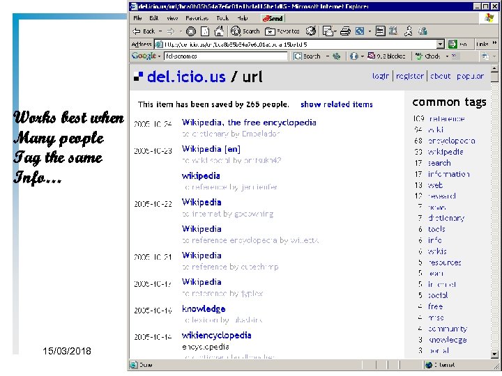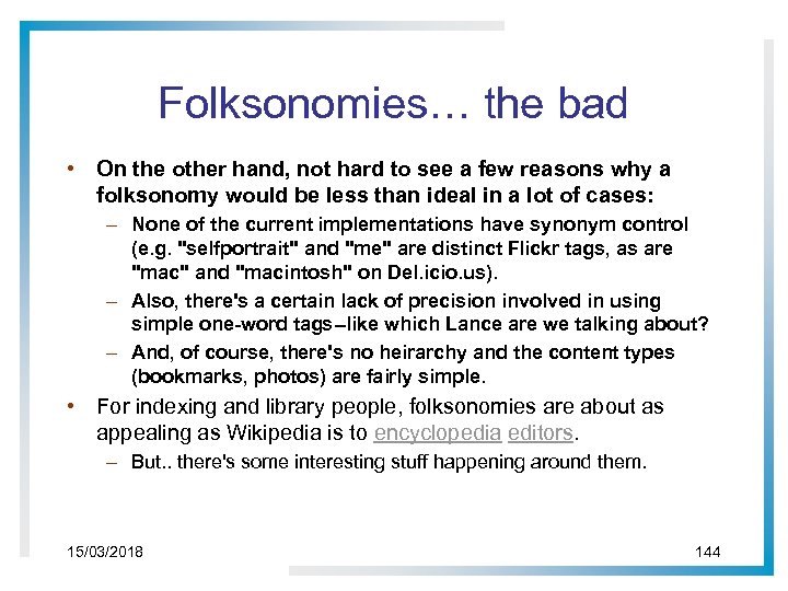 Folksonomies… the bad • On the other hand, not hard to see a few reasons why a folksonomy would be less than ideal in a lot of cases: – None of the current implementations have synonym control (e. g. "selfportrait" and "me" are distinct Flickr tags, as are "mac" and "macintosh" on Del. icio. us). – Also, there's a certain lack of precision involved in using simple one-word tags--like which Lance are we talking about? – And, of course, there's no heirarchy and the content types (bookmarks, photos) are fairly simple. • For indexing and library people, folksonomies are about as appealing as Wikipedia is to encyclopedia editors. – But. . there's some interesting stuff happening around them. 15/03/2018 144