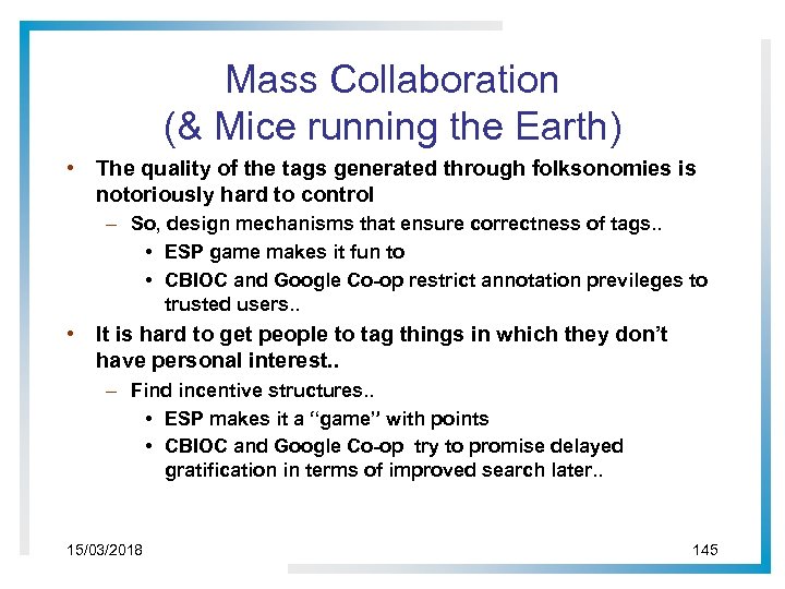 Mass Collaboration (& Mice running the Earth) • The quality of the tags generated through folksonomies is notoriously hard to control – So, design mechanisms that ensure correctness of tags. . • ESP game makes it fun to • CBIOC and Google Co-op restrict annotation previleges to trusted users. . • It is hard to get people to tag things in which they don’t have personal interest. . – Find incentive structures. . • ESP makes it a “game” with points • CBIOC and Google Co-op try to promise delayed gratification in terms of improved search later. . 15/03/2018 145