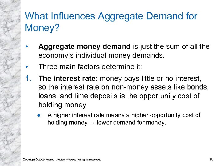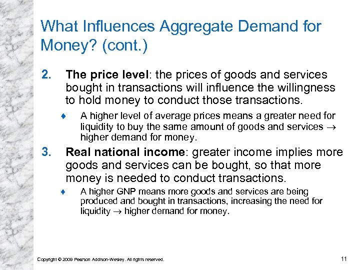 What Influences Aggregate Demand for Money? • Aggregate money demand is just the sum of all the economy’s individual money demands. • Three main factors determine it: 1. The interest rate: money pays little or no interest, so the interest rate on non-money assets like bonds, loans, and time deposits is the opportunity cost of holding money. ¨ A higher interest rate means a higher opportunity cost of holding money lower demand for money. Copyright © 2009 Pearson Addison-Wesley. All rights reserved. 10