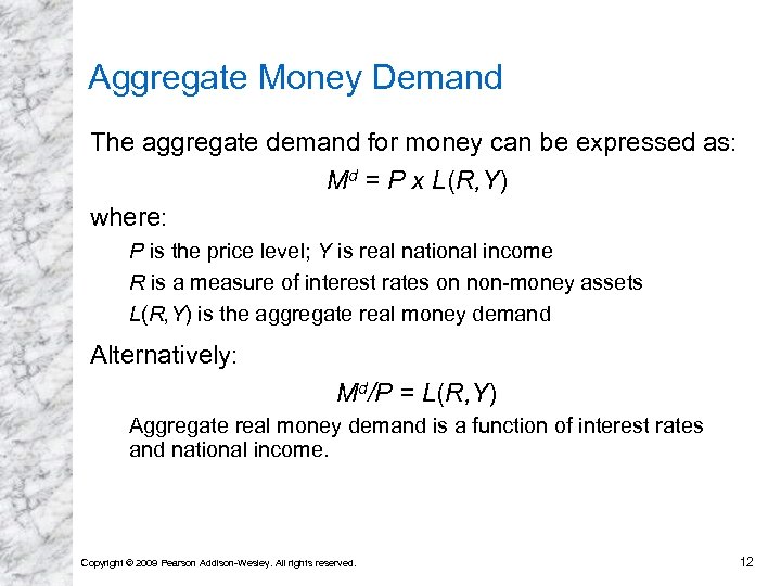 Aggregate Money Demand The aggregate demand for money can be expressed as: Md = P x L(R, Y) where: P is the price level; Y is real national income R is a measure of interest rates on non-money assets L(R, Y) is the aggregate real money demand Alternatively: Md/P = L(R, Y) Aggregate real money demand is a function of interest rates and national income. Copyright © 2009 Pearson Addison-Wesley. All rights reserved. 12