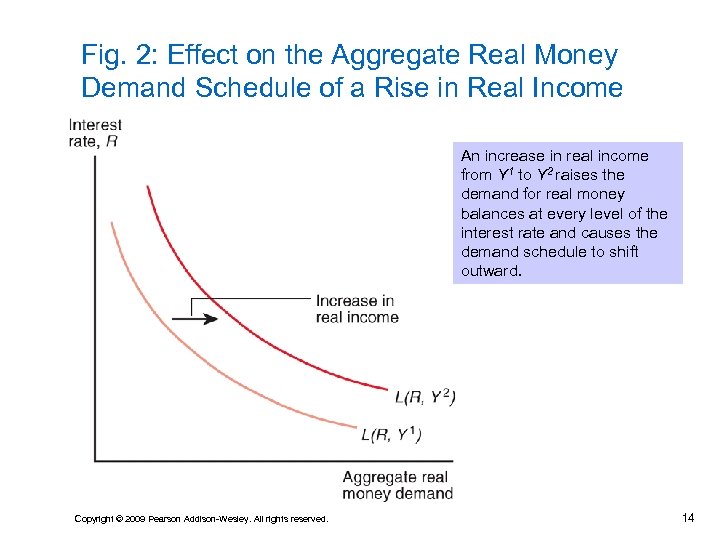 Fig. 1: Aggregate Real Money Demand the Interest Rate The downward sloping real money demand schedule, L(R, Y), shows that for a given real income level, Y, real money demand rises as the interest rate falls. Copyright © 2009 Pearson Addison-Wesley. All rights reserved. 13