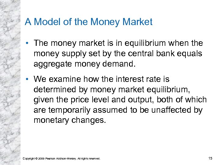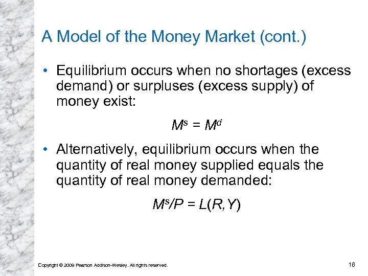 A Model of the Money Market • The money market is in equilibrium when the money supply set by the central bank equals aggregate money demand. • We examine how the interest rate is determined by money market equilibrium, given the price level and output, both of which are temporarily assumed to be unaffected by monetary changes. Copyright © 2009 Pearson Addison-Wesley. All rights reserved. 15