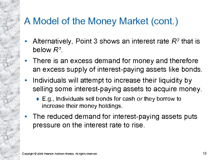 A Model of the Money Market (cont. ) • Point 1 in Fig. 3 shows the equilibrium interest rate is R 1. • Point 2 shows an interest rate R 2 that is above R 1. • There is an excess supply of money and therefore an excess demand for interest-paying assets like bonds. • Individuals will attempt to reduce their liquidity by using some money to buy interest-paying assets. ¨ E. g. , Individuals buy bonds with cash or they lend out their excess cash balances. • The increased demand for interest-paying assets puts pressure on the interest rate to fall. Copyright © 2009 Pearson Addison-Wesley. All rights reserved. 17