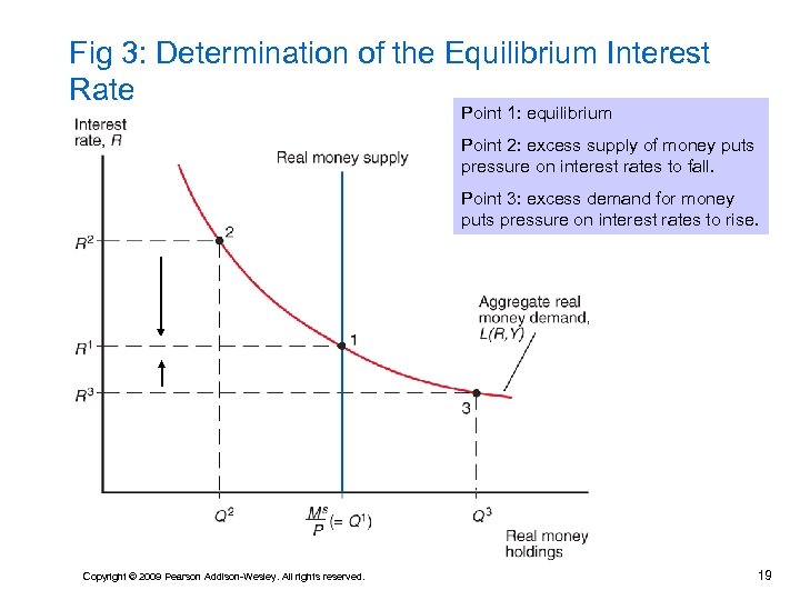 A Model of the Money Market (cont. ) • Alternatively, Point 3 shows an interest rate R 3 that is below R 1. • There is an excess demand for money and therefore an excess supply of interest-paying assets like bonds. • Individuals will attempt to increase their liquidity by selling some interest-paying assets to acquire money. ¨ E. g. , Individuals sell bonds for cash or they borrow to increase their money holdings. • The reduced demand for interest-paying assets puts pressure on the interest rate to rise. Copyright © 2009 Pearson Addison-Wesley. All rights reserved. 18