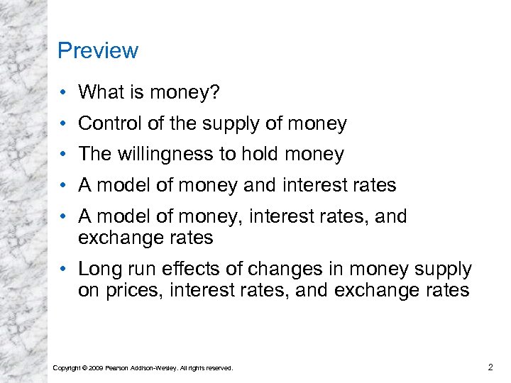 Preview • What is money? • Control of the supply of money • The willingness to hold money • A model of money and interest rates • A model of money, interest rates, and exchange rates • Long run effects of changes in money supply on prices, interest rates, and exchange rates Copyright © 2009 Pearson Addison-Wesley. All rights reserved. 2