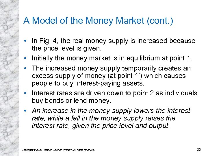 Fig 3: Determination of the Equilibrium Interest Rate Point 1: equilibrium Point 2: excess supply of money puts pressure on interest rates to fall. Point 3: excess demand for money puts pressure on interest rates to rise. Copyright © 2009 Pearson Addison-Wesley. All rights reserved. 19