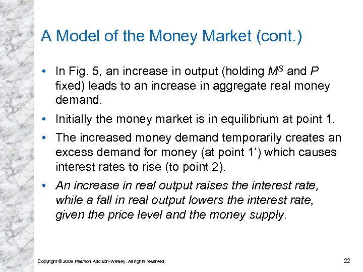 A Model of the Money Market (cont. ) • In Fig. 5, an increase in output (holding MS and P fixed) leads to an increase in aggregate real money demand. • Initially the money market is in equilibrium at point 1. • The increased money demand temporarily creates an excess demand for money (at point 1’) which causes interest rates to rise (to point 2). • An increase in real output raises the interest rate, while a fall in real output lowers the interest rate, given the price level and the money supply. Copyright © 2009 Pearson Addison-Wesley. All rights reserved. 22