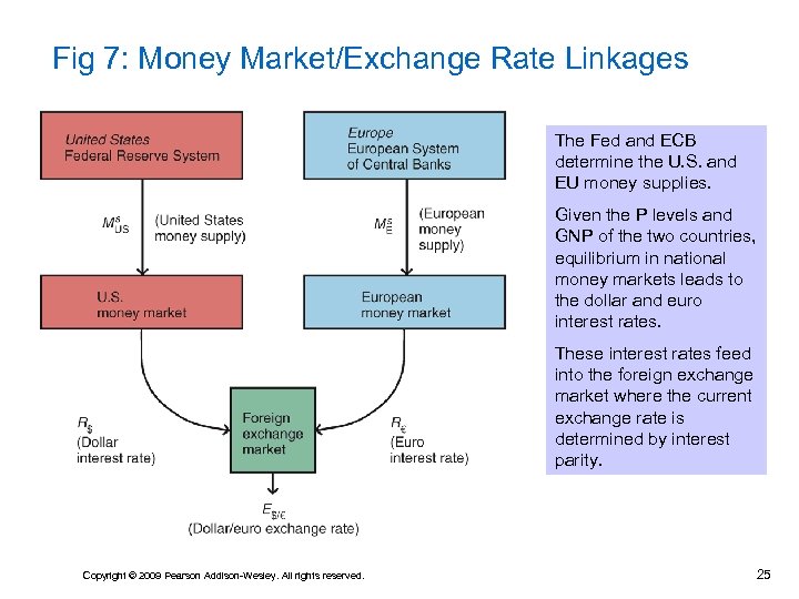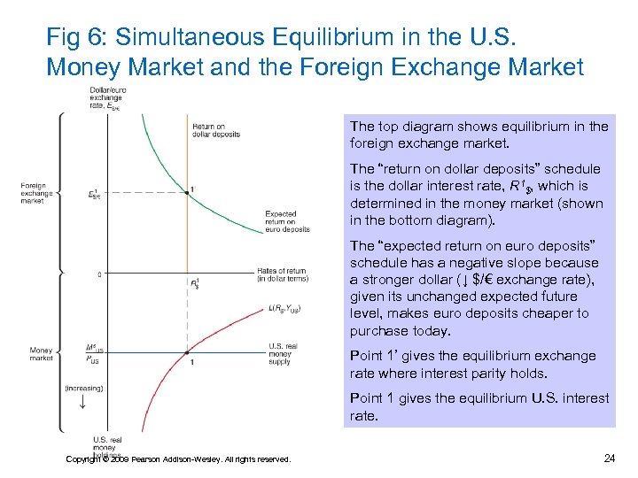 Fig 6: Simultaneous Equilibrium in the U. S. Money Market and the Foreign Exchange Market The top diagram shows equilibrium in the foreign exchange market. The “return on dollar deposits” schedule is the dollar interest rate, R 1$, which is determined in the money market (shown in the bottom diagram). The “expected return on euro deposits” schedule has a negative slope because a stronger dollar (↓ $/€ exchange rate), given its unchanged expected future level, makes euro deposits cheaper to purchase today. Point 1’ gives the equilibrium exchange rate where interest parity holds. Point 1 gives the equilibrium U. S. interest rate. Copyright © 2009 Pearson Addison-Wesley. All rights reserved. 24