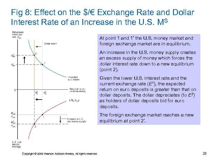 Fig 7: Money Market/Exchange Rate Linkages The Fed and ECB determine the U. S. and EU money supplies. Given the P levels and GNP of the two countries, equilibrium in national money markets leads to the dollar and euro interest rates. These interest rates feed into the foreign exchange market where the current exchange rate is determined by interest parity. Copyright © 2009 Pearson Addison-Wesley. All rights reserved. 25