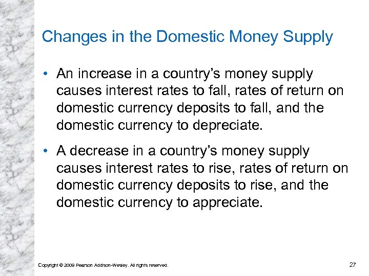 Changes in the Domestic Money Supply • An increase in a country’s money supply causes interest rates to fall, rates of return on domestic currency deposits to fall, and the domestic currency to depreciate. • A decrease in a country’s money supply causes interest rates to rise, rates of return on domestic currency deposits to rise, and the domestic currency to appreciate. Copyright © 2009 Pearson Addison-Wesley. All rights reserved. 27