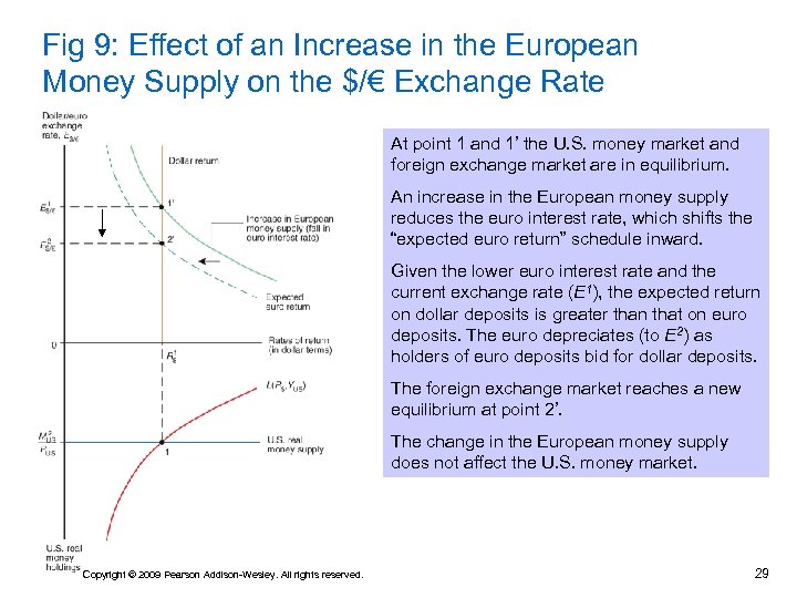 Changes in the Foreign Money Supply • How would an increase in the supply of euros affect the U. S. money market and foreign exchange markets? • An increase in the supply of euros reduces interest rates in the EU, reducing the expected rate of return on euro deposits. • This reduction in the expected rate of return on euro deposits causes the euro to depreciate. • We predict no change in the U. S. money market due to the change in the supply of euros. Copyright © 2009 Pearson Addison-Wesley. All rights reserved. 28