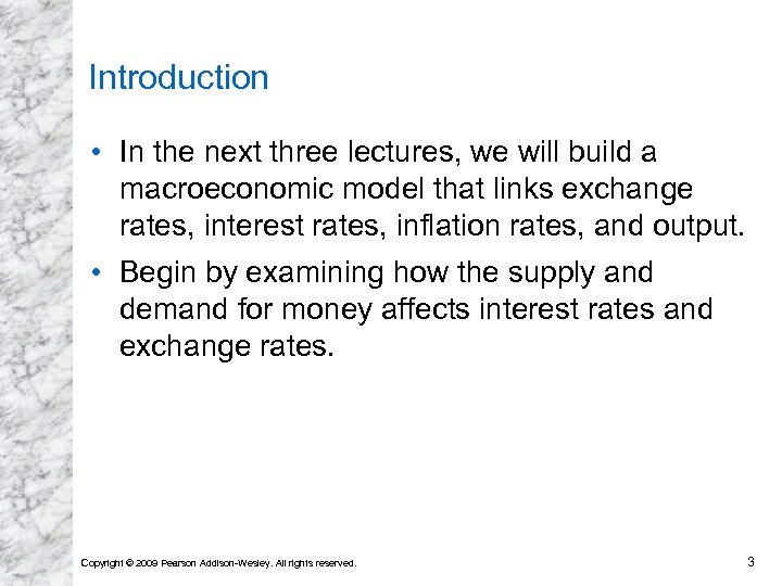 Introduction • In the next three lectures, we will build a macroeconomic model that links exchange rates, interest rates, inflation rates, and output. • Begin by examining how the supply and demand for money affects interest rates and exchange rates. Copyright © 2009 Pearson Addison-Wesley. All rights reserved. 3