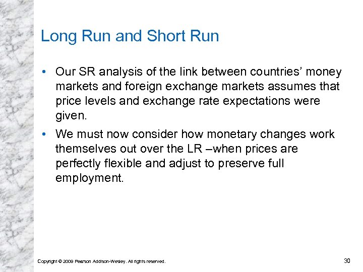 Long Run and Short Run • Our SR analysis of the link between countries’ money markets and foreign exchange markets assumes that price levels and exchange rate expectations were given. • We must now consider how monetary changes work themselves out over the LR –when prices are perfectly flexible and adjust to preserve full employment. Copyright © 2009 Pearson Addison-Wesley. All rights reserved. 30