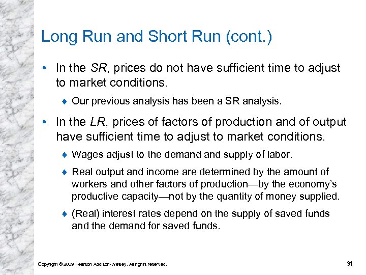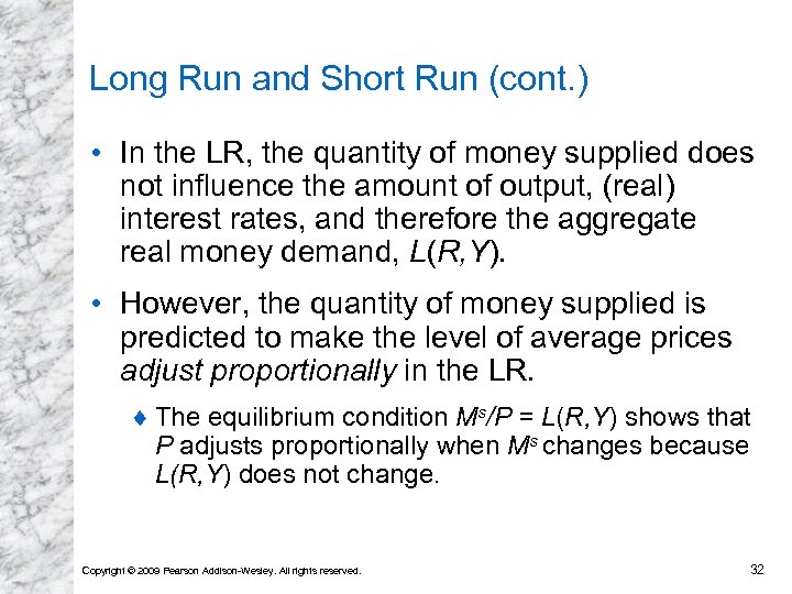 Long Run and Short Run (cont. ) • In the SR, prices do not have sufficient time to adjust to market conditions. ¨ Our previous analysis has been a SR analysis. • In the LR, prices of factors of production and of output have sufficient time to adjust to market conditions. ¨ Wages adjust to the demand supply of labor. ¨ Real output and income are determined by the amount of workers and other factors of production—by the economy’s productive capacity—not by the quantity of money supplied. ¨ (Real) interest rates depend on the supply of saved funds and the demand for saved funds. Copyright © 2009 Pearson Addison-Wesley. All rights reserved. 31