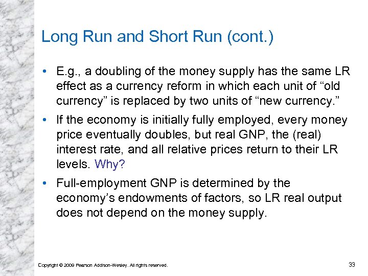 Long Run and Short Run (cont. ) • E. g. , a doubling of the money supply has the same LR effect as a currency reform in which each unit of “old currency” is replaced by two units of “new currency. ” • If the economy is initially fully employed, every money price eventually doubles, but real GNP, the (real) interest rate, and all relative prices return to their LR levels. Why? • Full-employment GNP is determined by the economy’s endowments of factors, so LR real output does not depend on the money supply. Copyright © 2009 Pearson Addison-Wesley. All rights reserved. 33