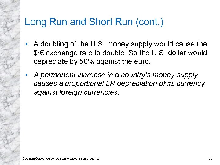 Long Run and Short Run (cont. ) • A doubling of the U. S. money supply would cause the $/€ exchange rate to double. So the U. S. dollar would depreciate by 50% against the euro. • A permanent increase in a country’s money supply causes a proportional LR depreciation of its currency against foreign currencies. Copyright © 2009 Pearson Addison-Wesley. All rights reserved. 35