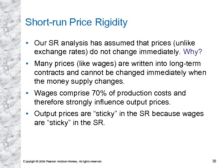 Short-run Price Rigidity • Our SR analysis has assumed that prices (unlike exchange rates) do not change immediately. Why? • Many prices (like wages) are written into long-term contracts and cannot be changed immediately when the money supply changes. • Wages comprise 70% of production costs and therefore strongly influence output prices. • Output prices are “sticky” in the SR because wages are “sticky” in the SR. Copyright © 2009 Pearson Addison-Wesley. All rights reserved. 36