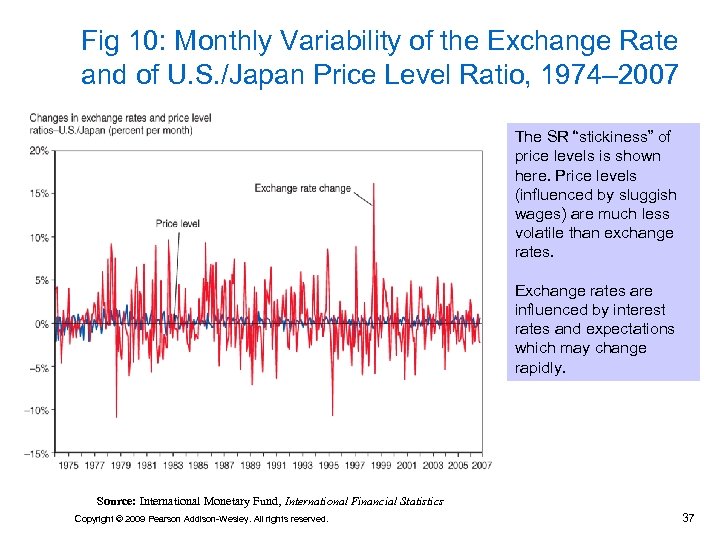 Fig 10: Monthly Variability of the Exchange Rate and of U. S. /Japan Price Level Ratio, 1974– 2007 The SR “stickiness” of price levels is shown here. Price levels (influenced by sluggish wages) are much less volatile than exchange rates. Exchange rates are influenced by interest rates and expectations which may change rapidly. Source: International Monetary Fund, International Financial Statistics Copyright © 2009 Pearson Addison-Wesley. All rights reserved. 37
