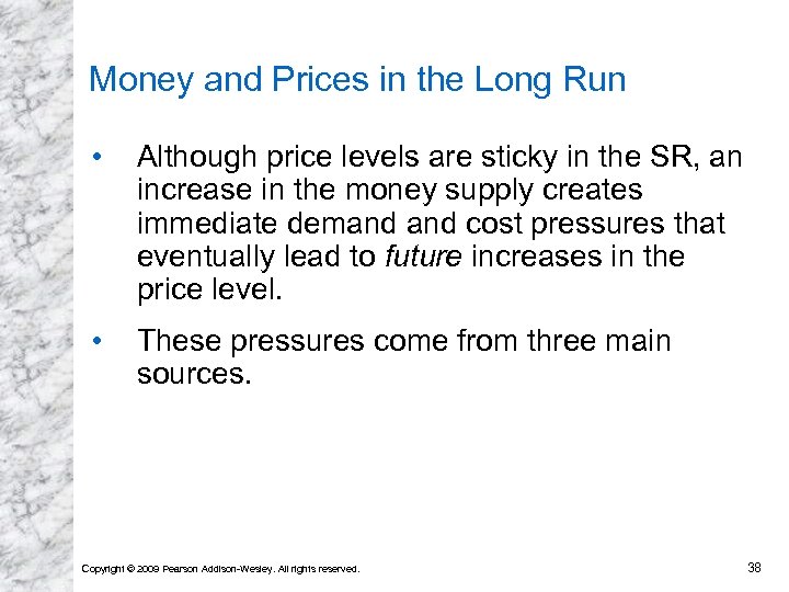 Money and Prices in the Long Run • Although price levels are sticky in the SR, an increase in the money supply creates immediate demand cost pressures that eventually lead to future increases in the price level. • These pressures come from three main sources. Copyright © 2009 Pearson Addison-Wesley. All rights reserved. 38