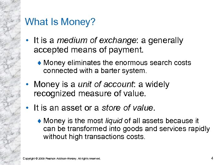 What Is Money? • It is a medium of exchange: a generally accepted means of payment. ¨ Money eliminates the enormous search costs connected with a barter system. • Money is a unit of account: a widely recognized measure of value. • It is an asset or a store of value. ¨ Money is the most liquid of all assets because it can be transformed into goods and services rapidly without high transactions costs. Copyright © 2009 Pearson Addison-Wesley. All rights reserved. 4