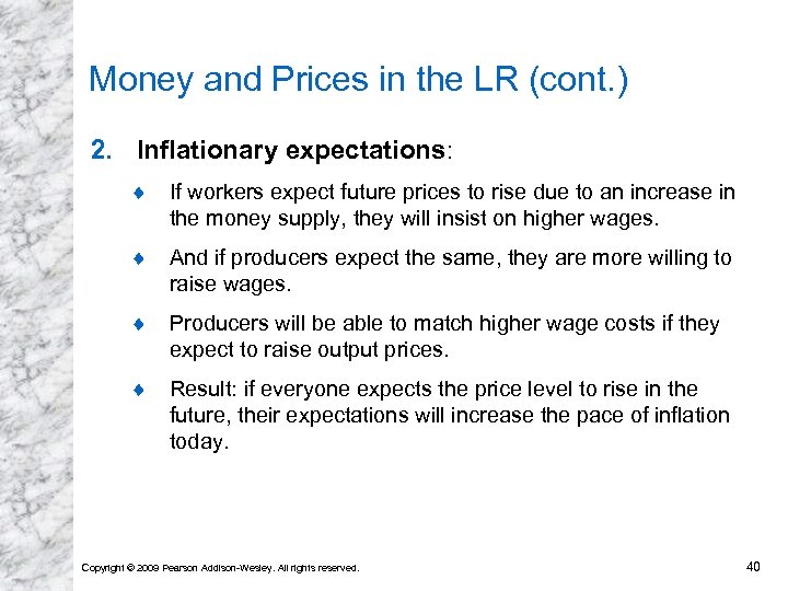 Money and Prices in the LR (cont. ) 1. Excess demand for output and labor: a higher quantity of money supplied implies that people have more funds available to pay for goods and services. ¨ To meet high demand, producers hire more workers or make existing employees work harder. ¨ Wages rise to attract more workers or to compensate workers for overtime. ¨ Prices of output will eventually rise to compensate for higher labor costs. Copyright © 2009 Pearson Addison-Wesley. All rights reserved. 39