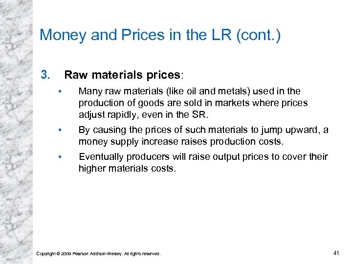 Money and Prices in the LR (cont. ) 3. Raw materials prices: • Many raw materials (like oil and metals) used in the production of goods are sold in markets where prices adjust rapidly, even in the SR. • By causing the prices of such materials to jump upward, a money supply increase raises production costs. • Eventually producers will raise output prices to cover their higher materials costs. Copyright © 2009 Pearson Addison-Wesley. All rights reserved. 41