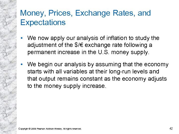 Money, Prices, Exchange Rates, and Expectations • We now apply our analysis of inflation to study the adjustment of the $/€ exchange rate following a permanent increase in the U. S. money supply. • We begin our analysis by assuming that the economy starts with all variables at their long-run levels and that output remains constant as the economy adjusts to the money supply increase. Copyright © 2009 Pearson Addison-Wesley. All rights reserved. 42