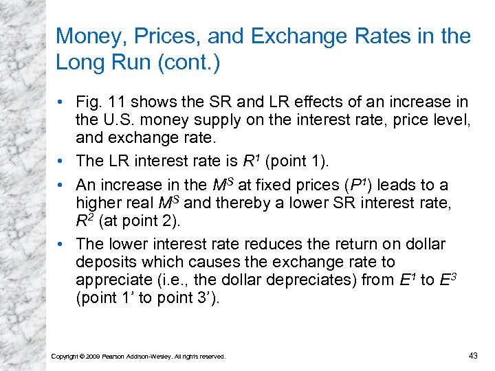Money, Prices, and Exchange Rates in the Long Run (cont. ) • Fig. 11 shows the SR and LR effects of an increase in the U. S. money supply on the interest rate, price level, and exchange rate. • The LR interest rate is R 1 (point 1). • An increase in the MS at fixed prices (P 1) leads to a higher real MS and thereby a lower SR interest rate, R 2 (at point 2). • The lower interest rate reduces the return on dollar deposits which causes the exchange rate to appreciate (i. e. , the dollar depreciates) from E 1 to E 3 (point 1’ to point 3’). Copyright © 2009 Pearson Addison-Wesley. All rights reserved. 43