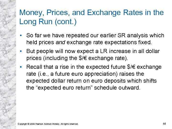 Money, Prices, and Exchange Rates in the Long Run (cont. ) • So far we have repeated our earlier SR analysis which held prices and exchange rate expectations fixed. • But people will now expect a LR increase in all dollar prices (including the $/€ exchange rate). • Recall that a rise in the expected future $/€ exchange rate (i. e. , a future euro appreciation) raises the expected dollar return on euro deposits which shifts the “expected euro return” schedule outward. Copyright © 2009 Pearson Addison-Wesley. All rights reserved. 44