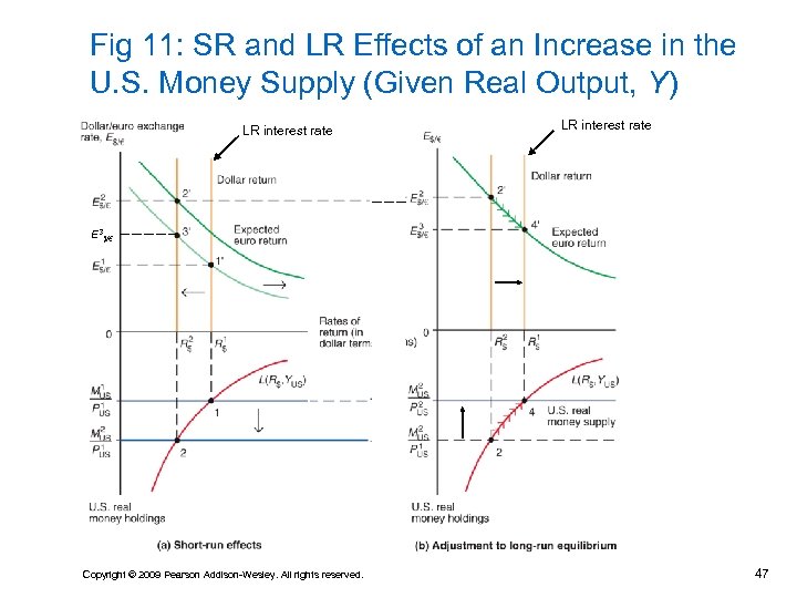 Fig 11: SR and LR Effects of an Increase in the U. S. Money Supply (Given Real Output, Y) LR interest rate E 3$/€ Copyright © 2009 Pearson Addison-Wesley. All rights reserved. 47