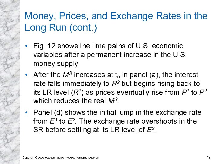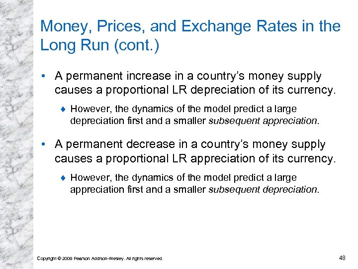 Money, Prices, and Exchange Rates in the Long Run (cont. ) • A permanent increase in a country’s money supply causes a proportional LR depreciation of its currency. ¨ However, the dynamics of the model predict a large depreciation first and a smaller subsequent appreciation. • A permanent decrease in a country’s money supply causes a proportional LR appreciation of its currency. ¨ However, the dynamics of the model predict a large appreciation first and a smaller subsequent depreciation. Copyright © 2009 Pearson Addison-Wesley. All rights reserved. 48