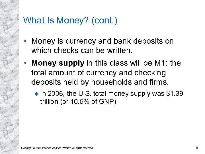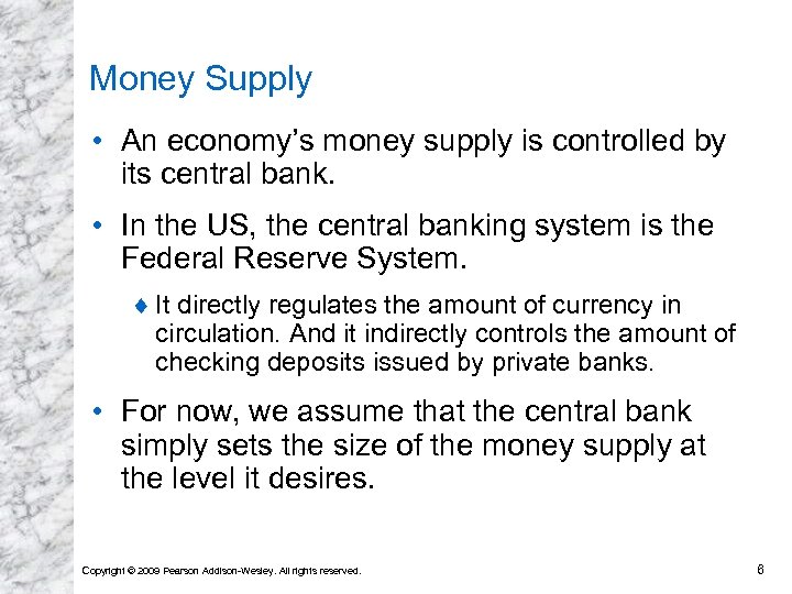 What Is Money? (cont. ) • Money is currency and bank deposits on which checks can be written. • Money supply in this class will be M 1: the total amount of currency and checking deposits held by households and firms. ¨ In 2006, the U. S. total money supply was $1. 39 trillion (or 10. 5% of GNP). Copyright © 2009 Pearson Addison-Wesley. All rights reserved. 5