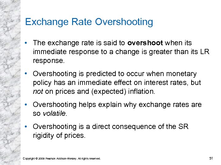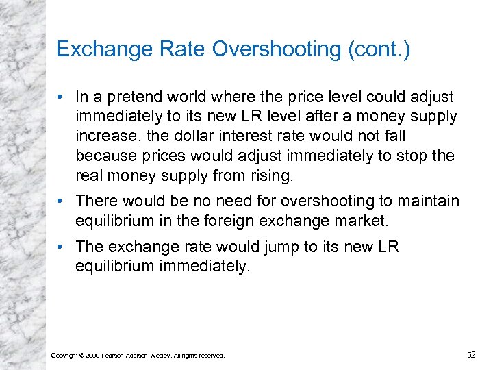 Exchange Rate Overshooting • The exchange rate is said to overshoot when its immediate response to a change is greater than its LR response. • Overshooting is predicted to occur when monetary policy has an immediate effect on interest rates, but not on prices and (expected) inflation. • Overshooting helps explain why exchange rates are so volatile. • Overshooting is a direct consequence of the SR rigidity of prices. Copyright © 2009 Pearson Addison-Wesley. All rights reserved. 51