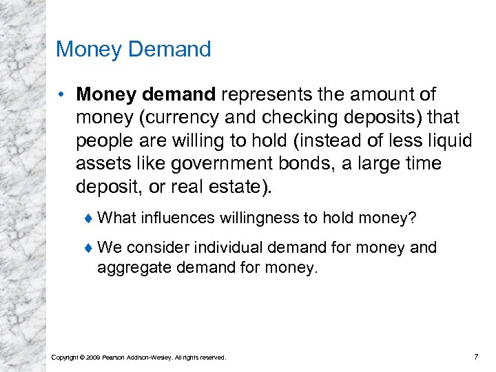 Money Supply • An economy’s money supply is controlled by its central bank. • In the US, the central banking system is the Federal Reserve System. ¨ It directly regulates the amount of currency in circulation. And it indirectly controls the amount of checking deposits issued by private banks. • For now, we assume that the central bank simply sets the size of the money supply at the level it desires. Copyright © 2009 Pearson Addison-Wesley. All rights reserved. 6