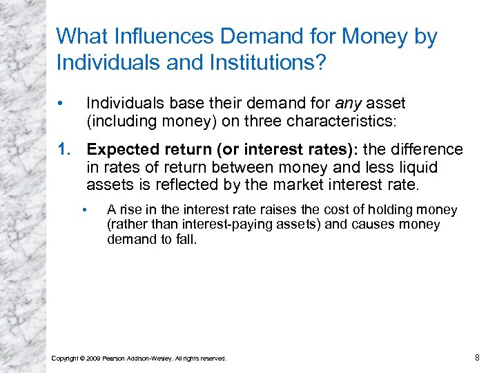 What Influences Demand for Money by Individuals and Institutions? • Individuals base their demand for any asset (including money) on three characteristics: 1. Expected return (or interest rates): the difference in rates of return between money and less liquid assets is reflected by the market interest rate. • A rise in the interest rate raises the cost of holding money (rather than interest-paying assets) and causes money demand to fall. Copyright © 2009 Pearson Addison-Wesley. All rights reserved. 8
