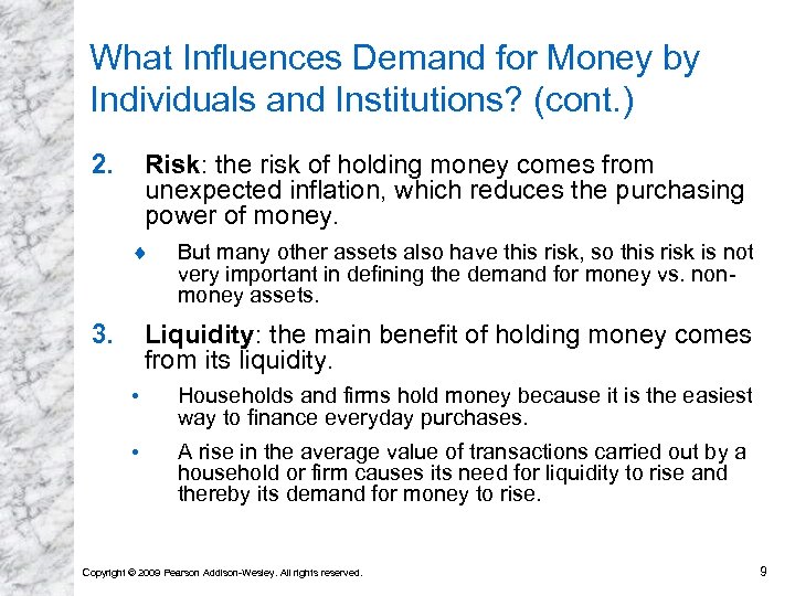 What Influences Demand for Money by Individuals and Institutions? (cont. ) 2. Risk: the risk of holding money comes from unexpected inflation, which reduces the purchasing power of money. ¨ 3. But many other assets also have this risk, so this risk is not very important in defining the demand for money vs. nonmoney assets. Liquidity: the main benefit of holding money comes from its liquidity. • Households and firms hold money because it is the easiest way to finance everyday purchases. • A rise in the average value of transactions carried out by a household or firm causes its need for liquidity to rise and thereby its demand for money to rise. Copyright © 2009 Pearson Addison-Wesley. All rights reserved. 9