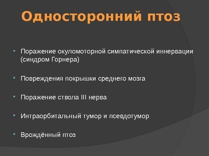 Односторонний птоз Поражение окуломоторной симпатической иннервации (синдром Горнера) Повреждения покрышки среднего мозга Поражение ствола III нерва Интраорбитальный тумор и псевдотумор Врождённый птоз