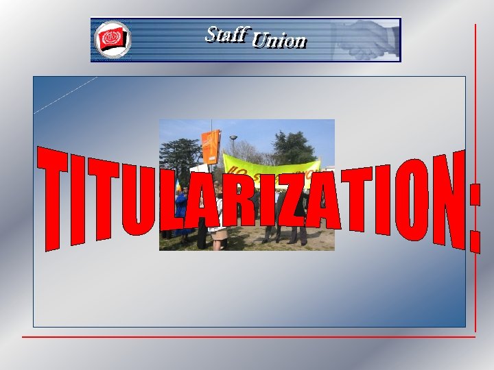 The Union agenda v v PROTECT TITULARIZATION PROCESS FROM THE COMMON SYSTEM DISADVANTAGES ACHIEVE EQUALITY BETWEEN G AND P STAFF EXTEND TITULARIZATION AT LEAST TO ALL COLLEAGUES IN BRANCH OFFICES PAID BY ILO PROTECT CINTERFOR, ISSA, INSTITUTE COLLEAGUES THROUGH LONGER CONTRACT PERIODS
