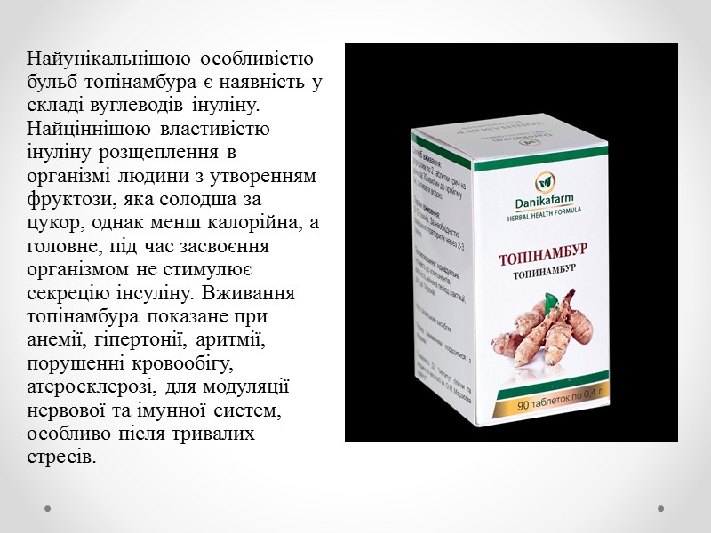 Найунікальнішою особливістю бульб топінамбура є наявність у складі вуглеводів інуліну. Найціннішою властивістю інуліну розщеплення в організмі людини з утворенням фруктози, яка солодша за цукор, однак менш калорійна, а головне, під час засвоєння організмом не стимулює секрецію інсуліну. Вживання топінамбура показане при анемії, гіпертонії, аритмії, порушенні кровообігу, атеросклерозі, для модуляції нервової та імунної систем, особливо після тривалих стресів.
