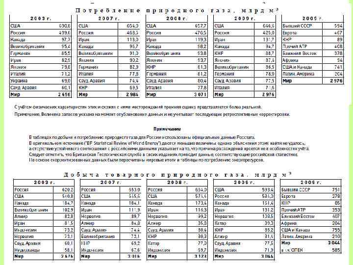 Мировое производство газа 2760 (млрд. м. куб) Регионы СНГ – 765 Северная Америка -705 Зарубежная Азия – 615 Зар. Европа – 300 Лат. Америка – 175 Африка – 160 Австралия - 40 Страны Млрд. м. куб. Россия 656 США 520 Канада 185 Великобритания 90 Иран 90 Алжир 90 Норвегия 85 Индонезия 75 Саудовская Аравия 70 Нидерланды Туркмения 60 60