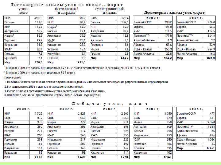 Уголь - 5865 (млн. т. ) Регионы Заруб. Азия – 2900 Сев. Америка – 1100 Зар. Европа – 685 СНГ - 465 Австралия – 375 Африка – 255 Лат. Америка - 85 Страны Млн. т. Китай 2200 США 1030 Индия 430 Австралия 350 Россия 310 ЮАР 250 ФРГ 200 Польша 160 Индонезия 135 Казахстан 85
