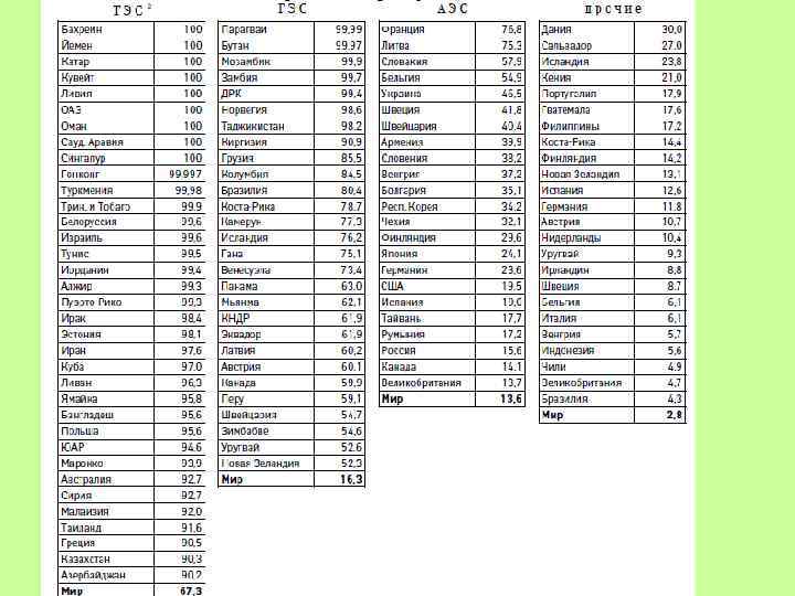 Производство эл/энергии в мире и странах на электростанциях разного типа ТЭС – 60 % ГЭС – 20% АЭС -17% ФРГ – 81. 7 Норвегия – 99. 5 Литва - 85 Китай – 80. 2 Бразилия – 82. 7 Франция – 78, 5 США – 71. 4 Австрия - 80 Швейцария - 80 Словакия - 57 Великобритания - 69 Новая Зеландия - 80 Бельгия - 56 Россия - 64. 3 Гондурас - 80 Гватемала -80 Шри-Ланка - 80 Швеция – 50 Украина – 44, 6 Испания -30 Индия – 61. 8 Канада – 57. 9 Индия – 29. 9 Япония - 60 Россия – 20. 5 Япония -29. 8 Китай – 18. 5 Великобритания – 29. 2 ФРГ – 14. 6 США – 20. 7 Франция – 13. 4 Россия - 15