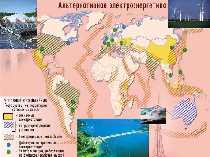 Лидеры по добыче газа в регионах мира Альтернативные источники энергии • • Геотермальные электростанции: Филиппины, Исландия, Россия, Япония, США • Приливные электростанции: Франция, Канада, Россия, Китай, Индия • Солнечные электростанции: США, Австралия, Туркменистан(в тридцати странах мира) • Ветроэнергетические установки: Германия, Дания, Великобритания, Нидерланды, США, Китай,