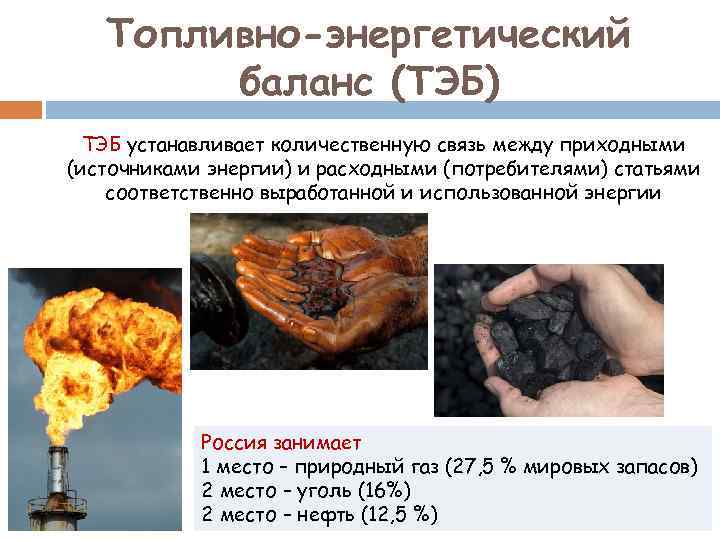 Топливно-энергетический баланс (ТЭБ) ТЭБ устанавливает количественную связь между приходными (источниками энергии) и расходными (потребителями) статьями соответственно выработанной и использованной энергии Россия занимает 1 место – природный газ (27, 5 % мировых запасов) 2 место – уголь (16%) 2 место – нефть (12, 5 %)