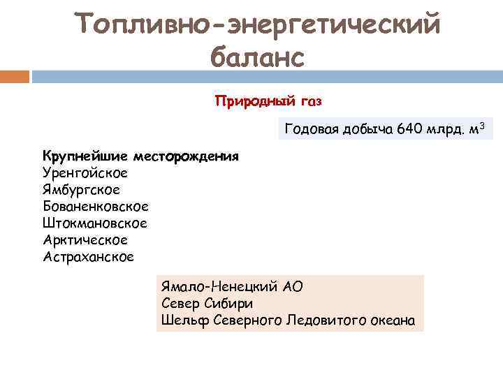 Топливно-энергетический баланс Природный газ Годовая добыча 640 млрд. м 3 Крупнейшие месторождения Уренгойское Ямбургское Бованенковское Штокмановское Арктическое Астраханское Ямало-Ненецкий АО Север Сибири Шельф Северного Ледовитого океана
