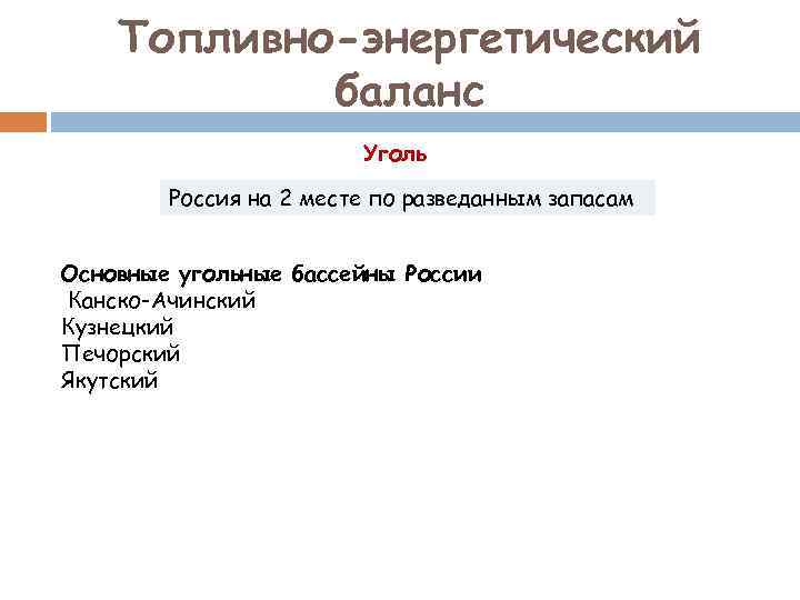 Топливно-энергетический баланс Уголь Россия на 2 месте по разведанным запасам Основные угольные бассейны России Канско-Ачинский Кузнецкий Печорский Якутский