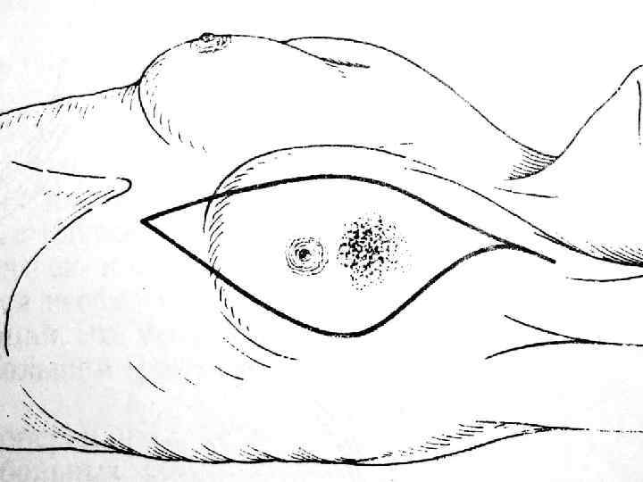 Вскрытие ретромаммарного абсцесса • дугообразный разрез по переходной складке (разрез Банденгейера)