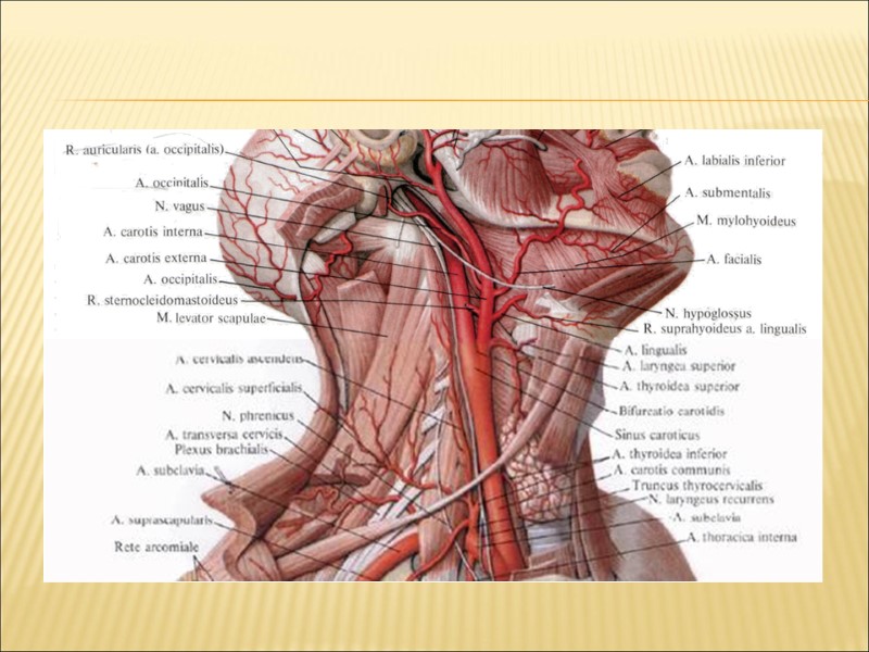 Кровоснабжение задней области шеи Кровоснабжение осуществляю ветви наружной сонной (затылочная, задняя ушная) и подключичной (поперечная артерия шеи, позвоночная артерия, глубокая артерия шеи – ветвь реберно-шейного ствола) артерий. Венозный отток осуществляется через наружную яремную вену и вены, одноименные с артериями, во внутреннюю яремную вену. Лимфатический отток осуществляется сверху вниз и латерально, лимфа оттекает в затылочные, глубокие шейные лимфатические узлы.