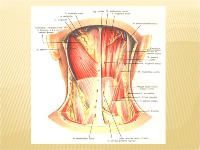 Послойная топография задней области шеи Кожа ПЖК Фасции - поверхностная - собственная (поверхностный и глубокий листки) Мышцы - поверхностный слой (трапециевидная мышца) - глубокий (ременные мышцы головы и шеи, мышцы, поднимающие лопатки, верхний край малой ромбовидной мышцы, мышцы, выпрямитель туловища, собственные мышцы позвоночника, подзатылочные мышцы.