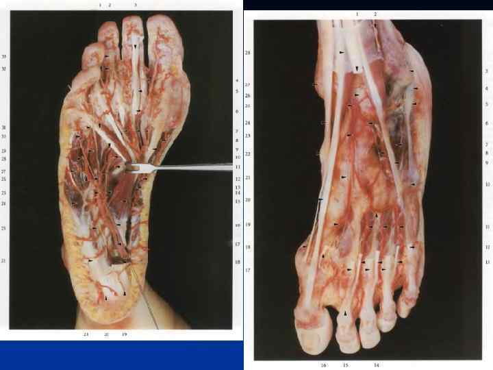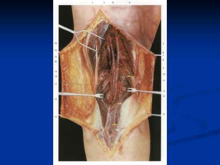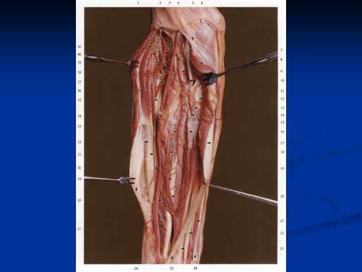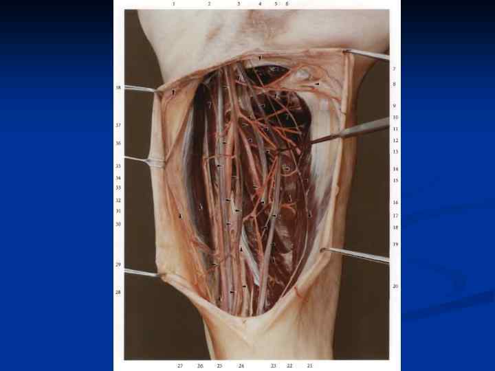 Области коллатерального кровообращения. На нижней конечности: 1. Анастомозы бедренной артерии выше отхождения глубокой артерии бедра: - ветви внутренней подвздошной артерии - ветви глубокой артерии бедра 2. Анастомозы бедренной артерии ниже отхождения глубокой артерии бедра: - ветви бедренной артерии - ветви подколенной артерии 3. Анастомозы бедренной артерии в Н/3 бедра: - ветви бедренной и подколенной артерии - ветви коленного сустава 4. Анастомозы подошвы - поверхностная и глубокая артериальные дуги